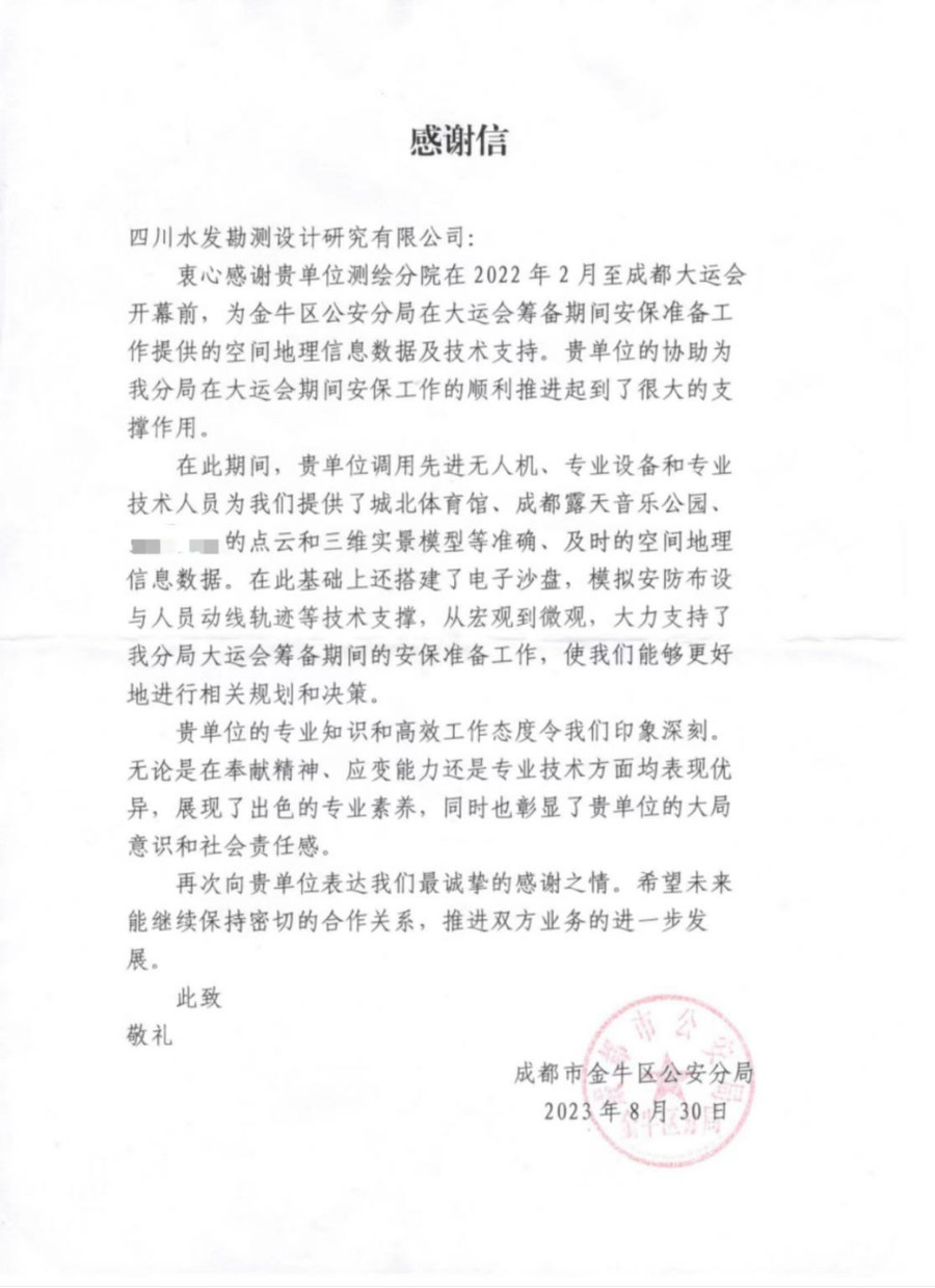 信中指出,設(shè)計(jì)公司測(cè)繪分院在大運(yùn)會(huì)籌備期間所展現(xiàn)出的專業(yè)知識(shí)和高效的工作態(tài)度令金牛區(qū)公安分局印象深刻,無論是在奉獻(xiàn)精神、應(yīng)變能力還是專業(yè)技術(shù)方面均表現(xiàn)優(yōu)異,展現(xiàn)了出色的專業(yè)素養(yǎng),同時(shí)也彰顯了設(shè)計(jì)公司的大局意識(shí)和社會(huì)責(zé)任感。