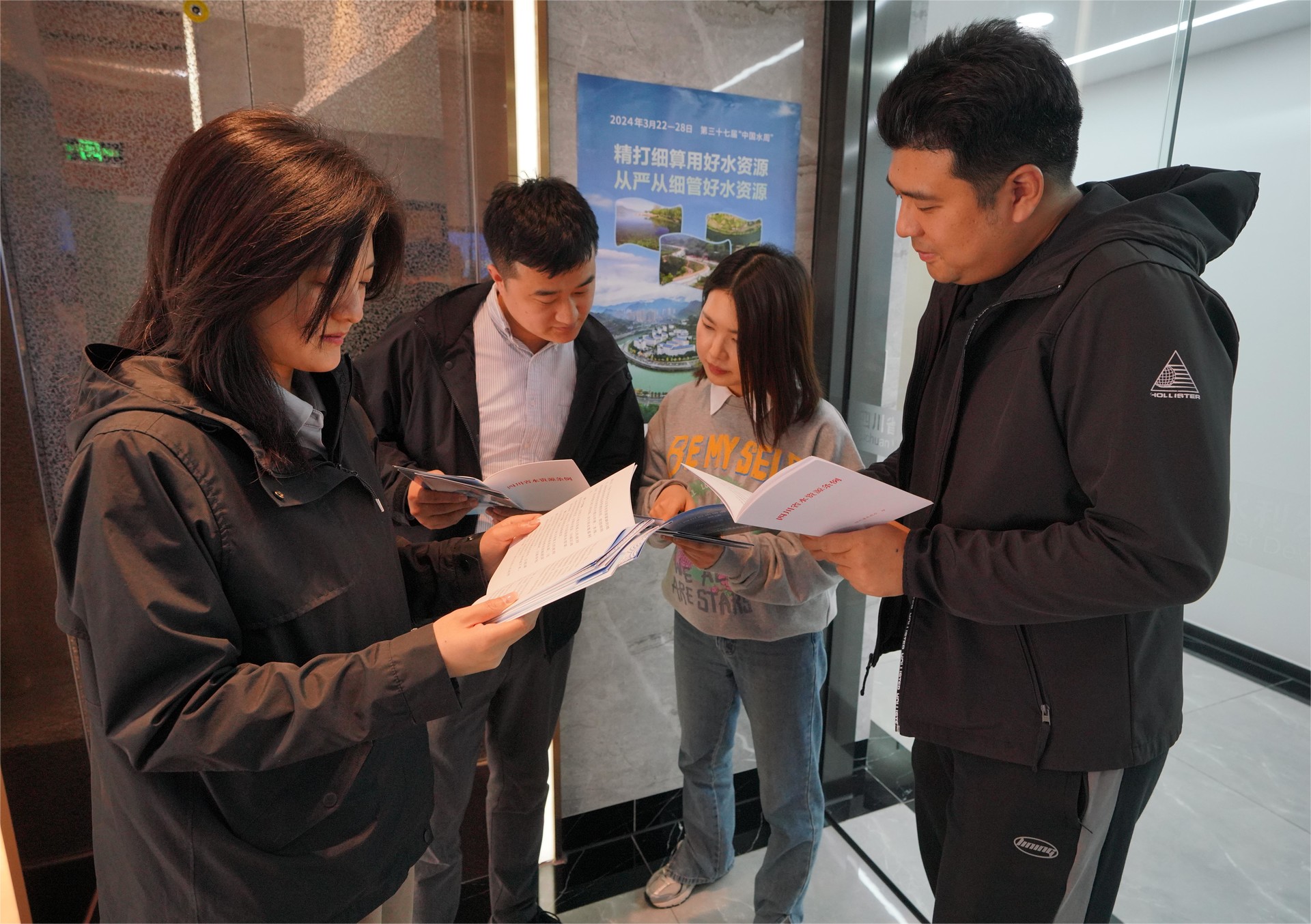 在集團總部,宣傳機連續(xù)播放中央電視臺紀錄片《治水記》,讓大家直觀感受在習近平總書記關(guān)于治水思想的指引下,中國水利建設(shè)取得的顯著成就,見證治水興國的戰(zhàn)略思想為糧食安全、經(jīng)濟安全、社會安全、生態(tài)安全和國家安全提供的有力保障。同時,統(tǒng)籌下屬企業(yè)全面啟動世界水日、中國水周宣傳活動,傳遞節(jié)水理念,充分利用現(xiàn)有宣傳平臺,分發(fā)張貼宣傳海報和制作科普小視頻,展現(xiàn)集團在建工程對有效保護、利用水資源的工作成效。