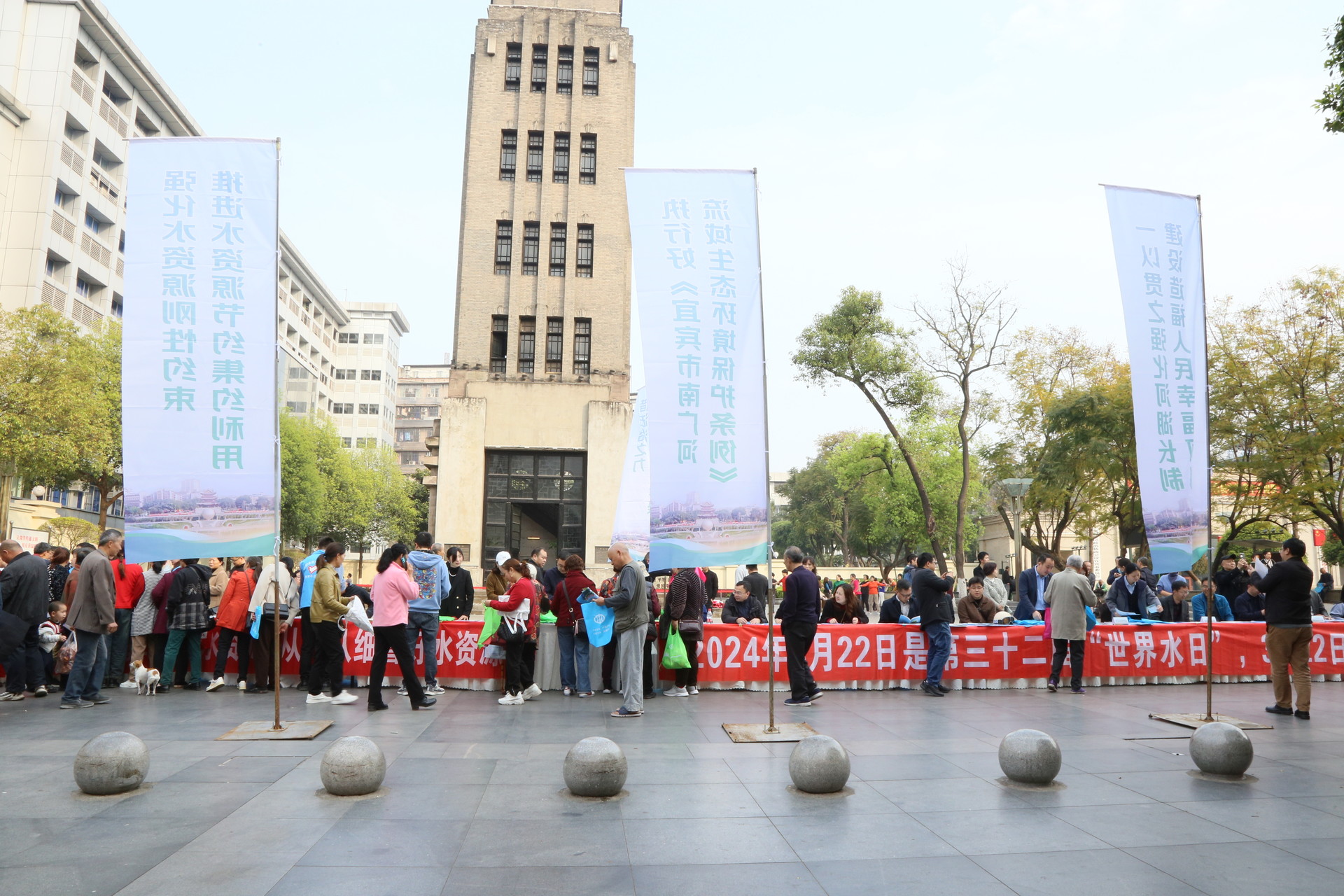 向家壩公司與宜賓市水利局聯(lián)合開展群眾性宣傳活動,在宜賓市翠屏區(qū)鐘鼓樓廣場,通過設(shè)點宣傳、懸掛宣傳條幅、發(fā)放宣傳手冊等多種形式,向市民宣傳水資源現(xiàn)狀、水資源保護的相關(guān)法律法規(guī)等內(nèi)容,提升市民節(jié)水用水意識。同時,在向家壩灌區(qū)工程施工現(xiàn)場、施工單位項目部等地,懸掛宣傳標語、張貼主題宣傳畫等,讓工地建設(shè)者積極行動起來,為高質(zhì)量建設(shè)向家壩灌區(qū)工程注入澎湃動力。