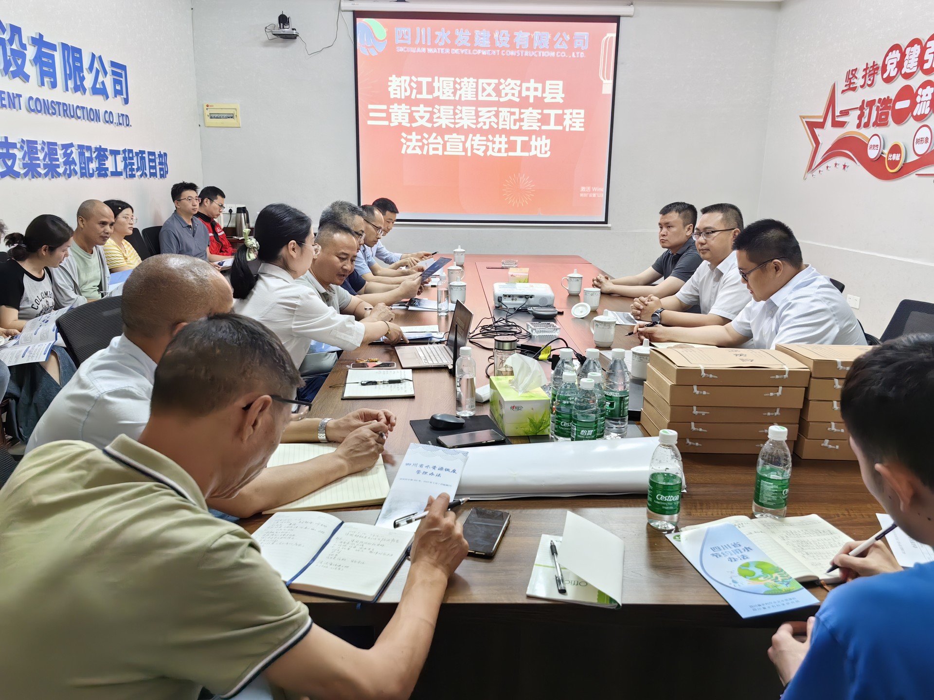 為進(jìn)一步增強(qiáng)建筑企業(yè)和一線施工人員的法治意識(shí)和法治觀念,5月14日,集團(tuán)副總經(jīng)理鄭祖杰帶隊(duì)到建設(shè)公司都江堰灌區(qū)資中縣三黃支渠開(kāi)展“法治宣傳進(jìn)工地”普法宣傳活動(dòng)并主持召開(kāi)座談會(huì),建設(shè)公司董事、總經(jīng)理羅雪、集團(tuán)審計(jì)法務(wù)部負(fù)責(zé)人等出席會(huì)議。