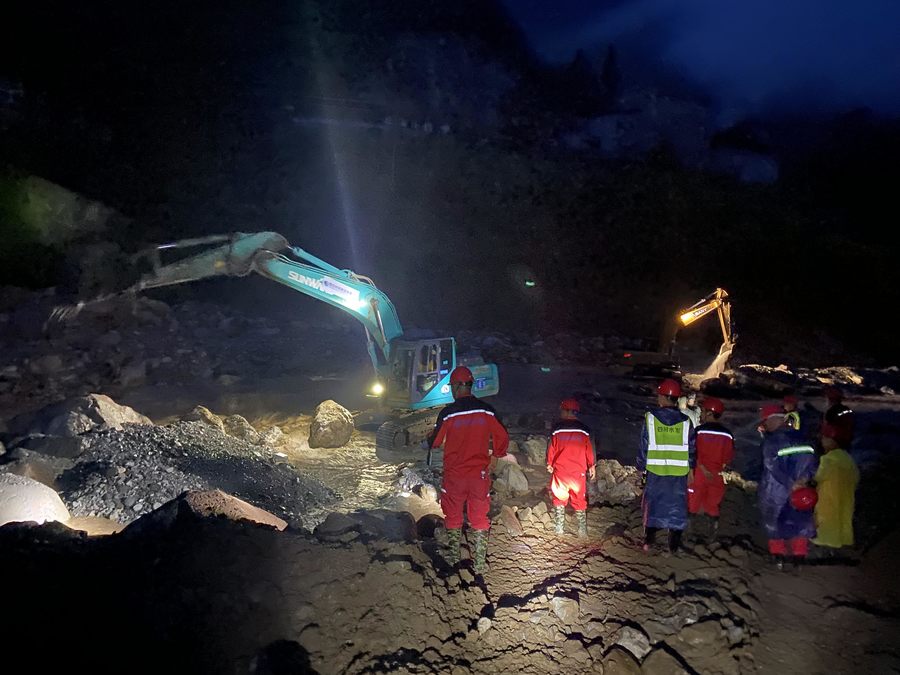 “時間就是生命!”應(yīng)急搶險突擊隊的兩名現(xiàn)場指揮均參加過“5·12”汶川地震搶險工作,他們深知在大災(zāi)大難面前,搶時間就是搶生命。山路坡陡彎急、崎嶇狹窄,加之狂風暴雨、碎石滾落,應(yīng)急搶險隊決定分批輕裝前行。第一批隊員攜6 臺挖掘機、3臺裝載機于6時50分抵達馬烈鄉(xiāng)新華村。9時左右,68名隊員集結(jié)完畢?!熬涂磕銈兞税?!”漢源縣人民政府黨組成員、副指揮長李樹敏強壓著悲痛對第一支進駐搶險現(xiàn)場的四川水發(fā)應(yīng)急搶險突擊隊分配搶險任務(wù)。