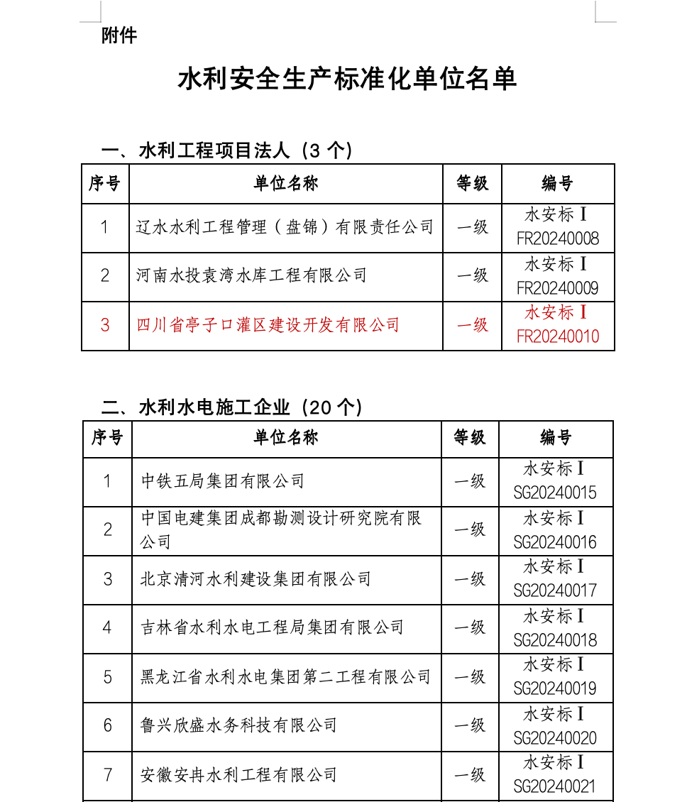 8月7日,水利部公布最新一批水利安全生產(chǎn)標(biāo)準(zhǔn)化一級(jí)達(dá)標(biāo)單位名單,亭子口公司光榮上榜。水利安全生產(chǎn)標(biāo)準(zhǔn)化等級(jí)是體現(xiàn)水利生產(chǎn)經(jīng)營(yíng)單位安全生產(chǎn)管理水平的“國(guó)家級(jí)”重要標(biāo)準(zhǔn),一級(jí)達(dá)標(biāo)是水利行業(yè)安全達(dá)標(biāo)的最高等級(jí),本批名單中項(xiàng)目法人達(dá)標(biāo)全國(guó)僅有3家單位。