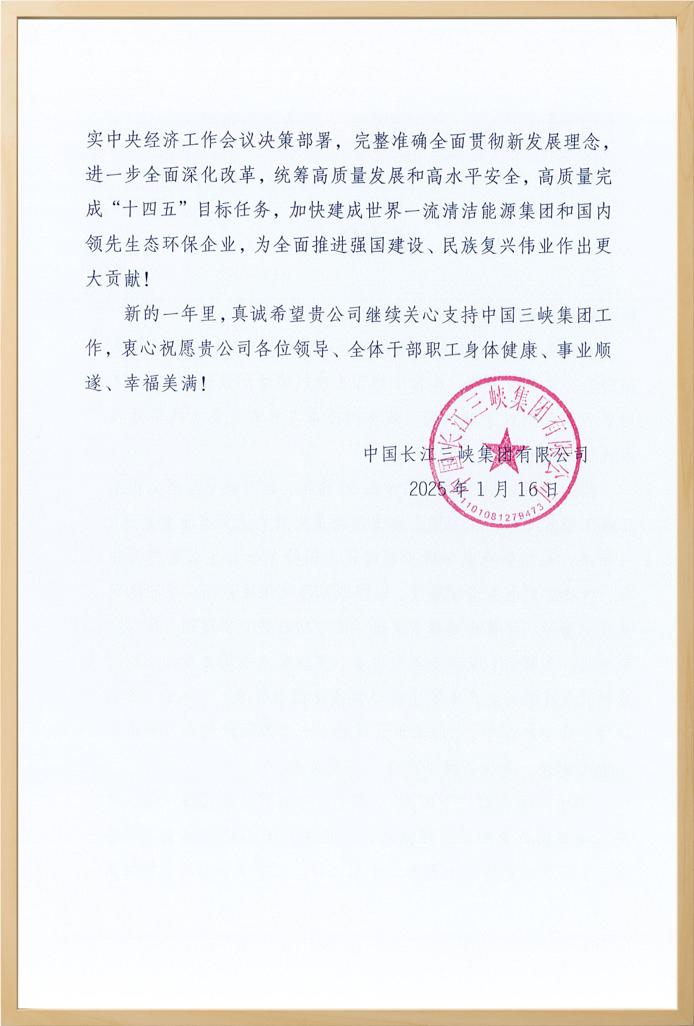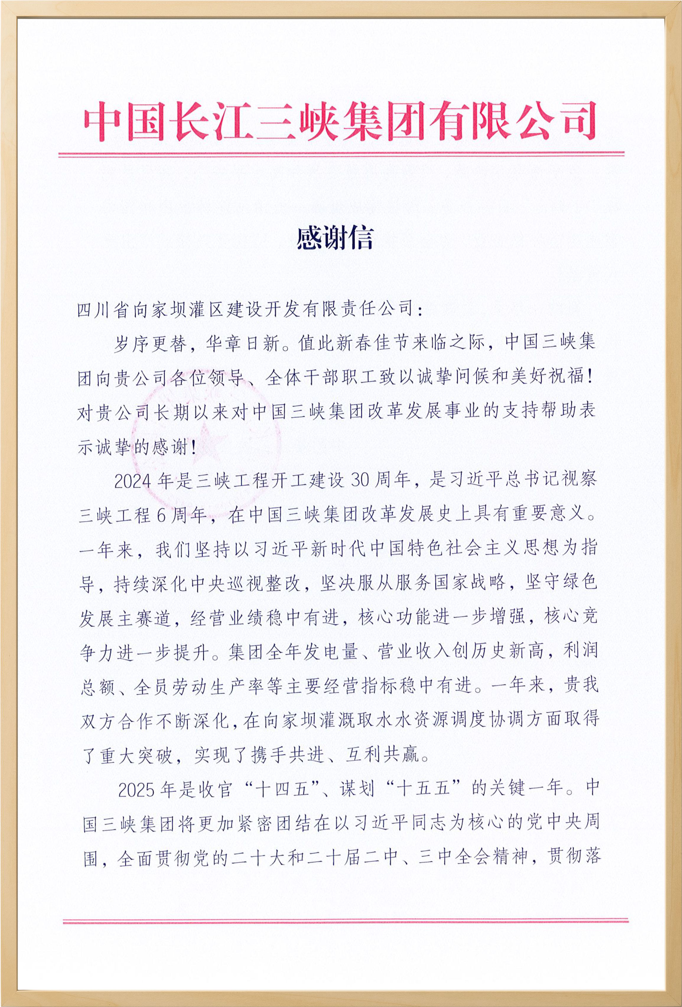 近日,向家壩公司收到了來自中國三峽集團的感謝信。在信中,中國三峽集團對向家壩公司在過去一年中的支持與合作表示了誠摯的感謝,并對雙方取得的合作成果給予了高度評價。